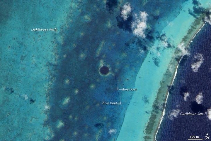The first image shows a sattelite view of the Great Blue Hole in Belize, capturing its near perfect circular shape and contrast with the surrounding reef waters. Attribution: Photo by NASA Earth Observatory (source)