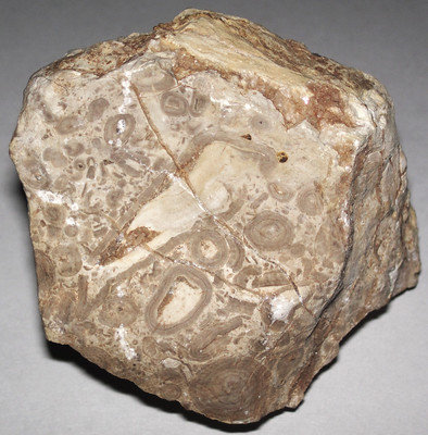 The image above shows the rock limestone. Limestone is a common rock that is found in marine environments and is mostly made up of crystalline calcium carbonate. Over time this crystalline calcium carbonate can react with acidic pH levels to become amorphous calcium carbonate (meaning it has no clearly defined chemical structure). Creative Common License, James St. John [2].