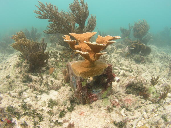 Featured Image: Elkhorn Coral (Acropora palmata) out planted in Dry Tortugas National Park, used to monitor coral growth in a wild environment.