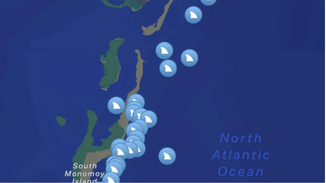 Shark tracking has shown South Monomoy Island has become a very popular White Shark hangout. Between August 15 and 17, Sharktivity app users reported eleven great white sightings in that area, with sharks between 50 and 100 yards from shore. The Atlantic White Shark Conservancy has been tracking one particular frequent-flier named Quadrilateral (11 ft, male) who has made several appearances in this area. Thankfully protected with no residents, Monomoy National Wildlife Refuge has been a favorite aggregation site for White Sharks since 2023.