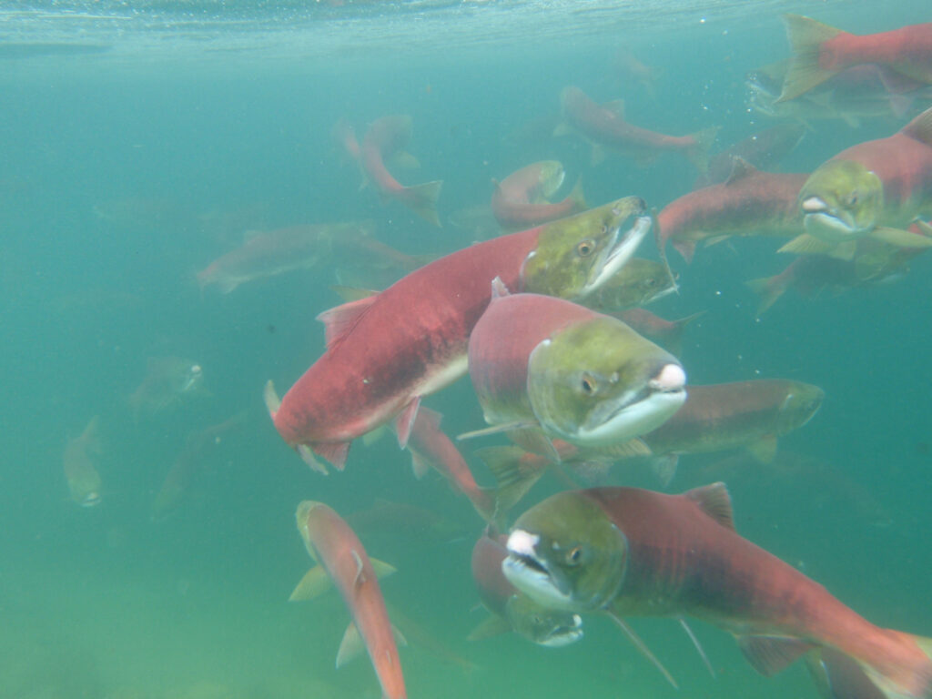 As they move upstream, their bodies undergo dramatic physiological changes, including reverse smoltification as they readjust from saltwater to freshwater conditions. Their coloration intensifies, and their remaining energy is redirected toward reproductive development. Pacific salmon are semelparous, meaning this single spawning event marks the end of their life cycle. After spawning, their bodies gradually die and decompose in the freshwater system, releasing marine-derived nutrients that enrich the surrounding ecosystem.