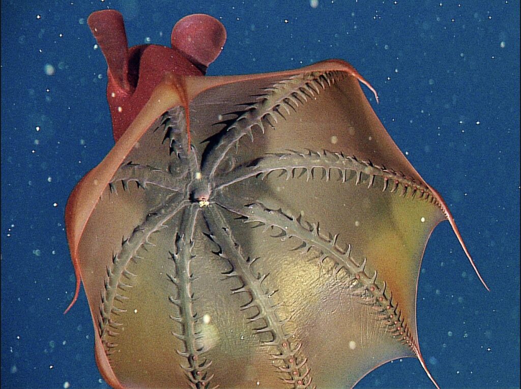 Image of the vampire squids “pineapple pose” – another defense mechanism (Image from National Geographic)