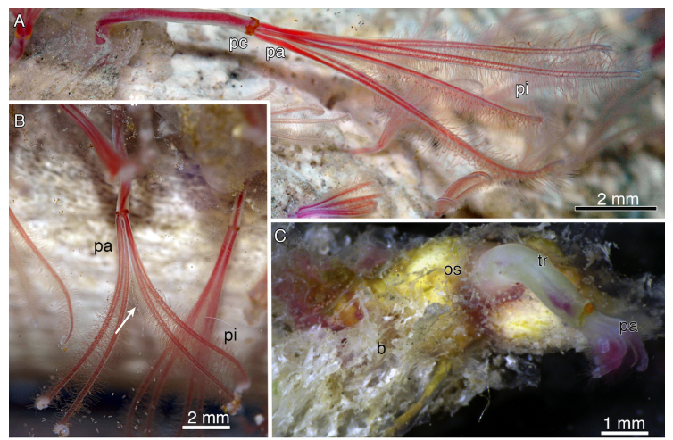 Osedax packardorum female; Rouse, G.W., Goffredi, S.K., Johnson, S. & Vrijenhoek, R.C. 2018. An inordinate fondness for Osedax (Siboglinidae: Annelida): Fourteen new species of bone worms from California. Zootaxa 4377(4): 451–489. DOI: 10.11646/zootaxa.4377.4.1; This file is licensed under the Creative Commons Attribution 3.0 Unported license.