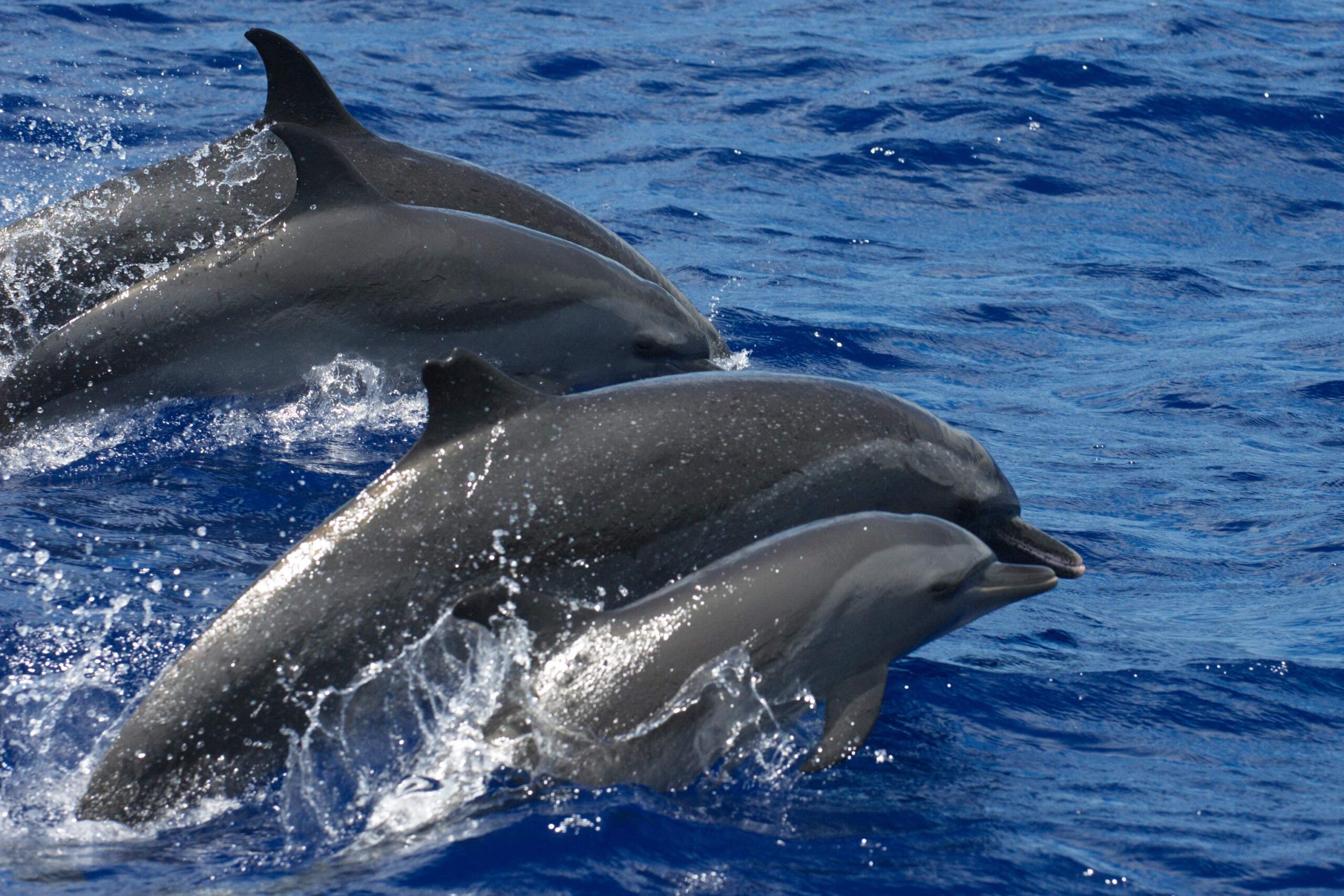 Credit: NOAA, Pacific Islands Fisheries Science Center Blog 2015 08 21, Two spotted dolphins breaching the surface of the ocean. One of the dolphins is missing the top part of its dorsal fin.