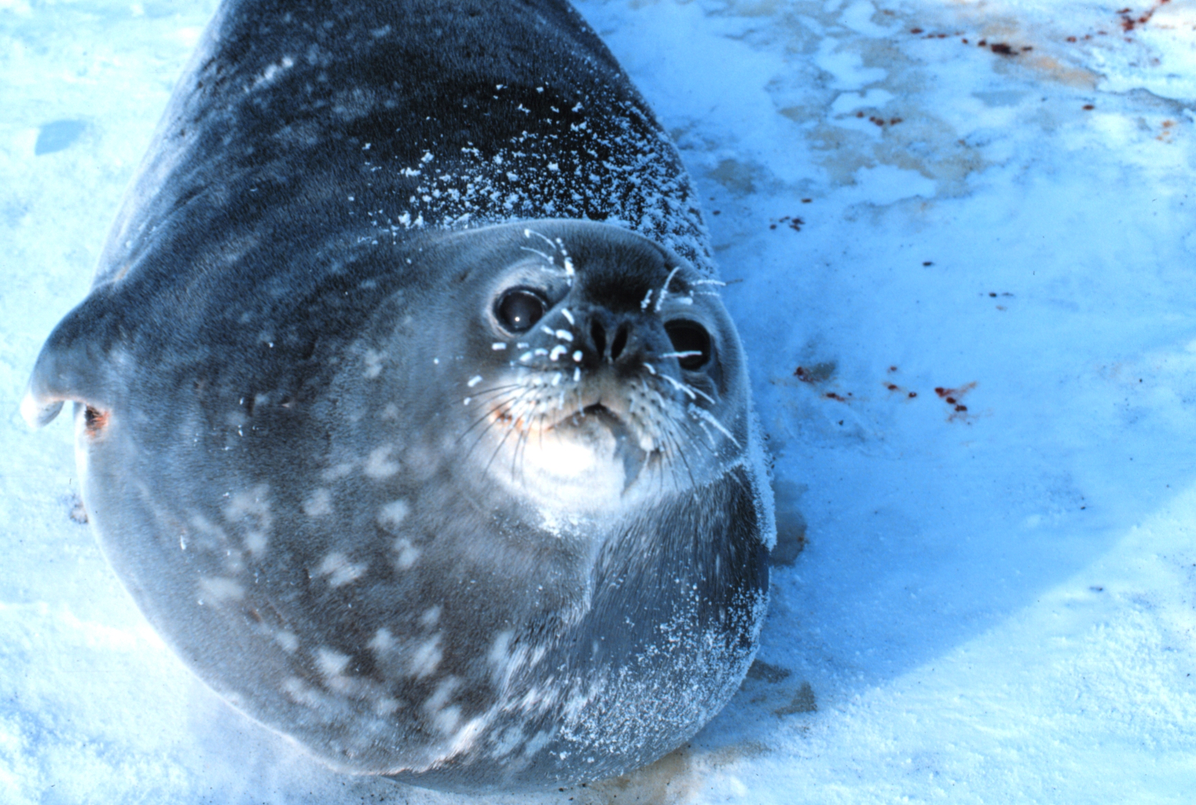 Credit: NOAA, Commander John Bortniak, A Weddell Seal dusted with snow sitting on the ice looking up at the camera.