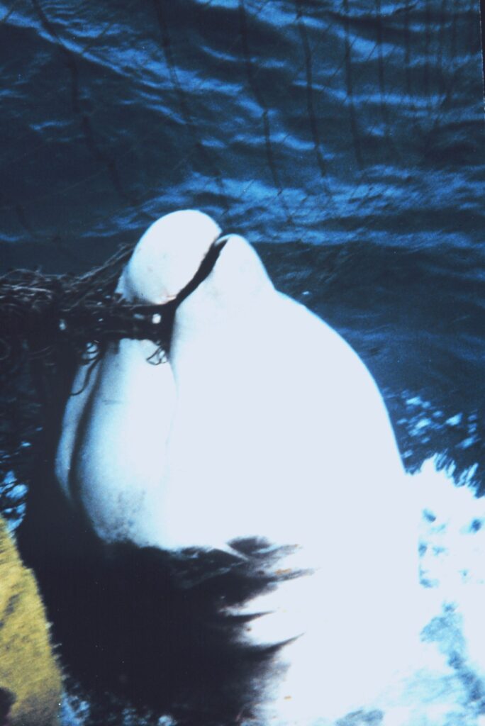Credit: NOAA, A marine mammal entangled in what appears to be a fishing net.