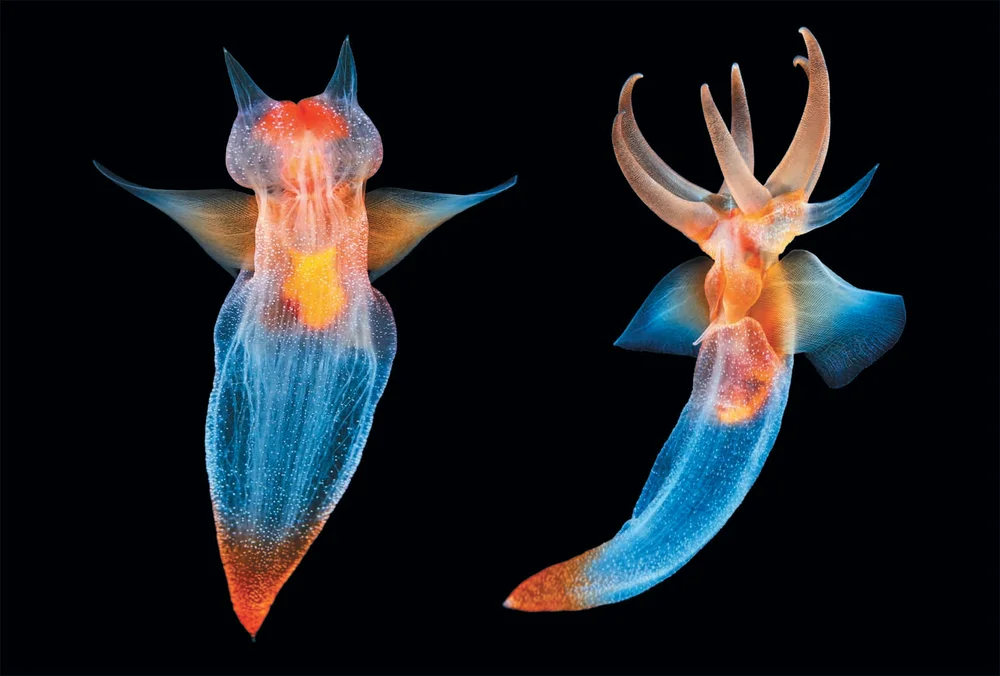 Sea angels are small, free-swimming marine snails belonging to a group of mollusks known as gymnosomes. They earn their name from their delicate, wing-like appearance and smooth, flowing movement through the water. Unlike most snails, they do not have shells as adults and instead possess translucent, gelatinous bodies. Common species, including Clione limacina and Clione antarctica, typically reach lengths of about 4–7 centimeters, yet their small size does not diminish their appeal to scientists and ocean explorers, who are drawn to their beauty and unusual anatomy. Their translucent bodies create an almost ghostlike effect, revealing internal organs that often display soft pink and orange tones. They swim using wing-like fins called parapodia, which move in a way that resembles flying, further emphasizing their angel-like quality. Altogether, their size, elegance, and specialized features make sea angels some of the most remarkable marine snails in the ocean.