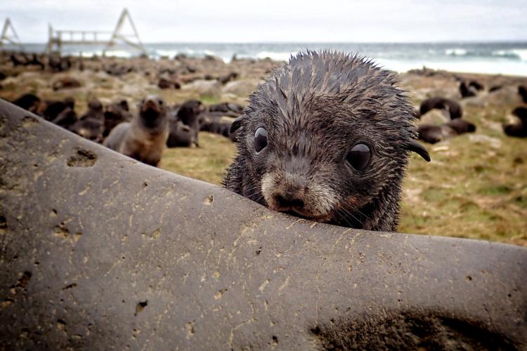 “A curious northern fur seal pup visits scientists hiding behind a rock, St Paul Island, Alaska. Credit: Lorrie Rea, University of Alaska Fairbanks”. (NOAA).