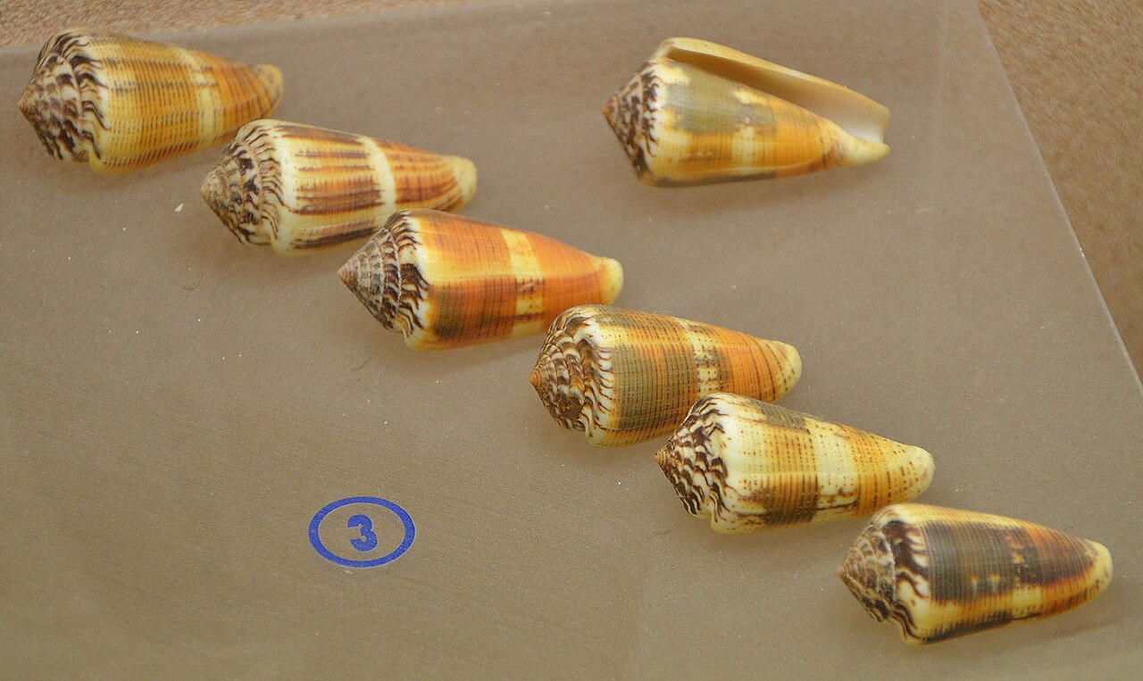 Cone snail is a general name for the many species in the family conidae. They are all classified by being marine gastropods that grow a large whorled shell that slowly grows into a cone shape, and by having a large modified tooth with a venom gland to deliver potent toxins to prey. You wouldn’t think that a simple unassuming marine snail could kill you, but that is where you would be wrong. If a human gets a sting from one of them, it could be deadly. Cone snails have killed at least 30 people as of 2016.